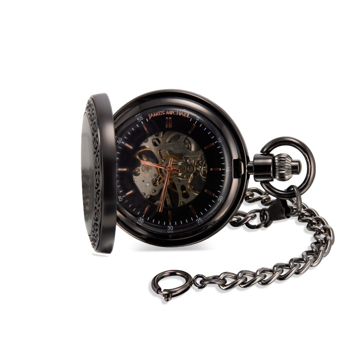 Black Gunmetal Skeleton Pocket Watch – Omega Border, Rose Gold Accents